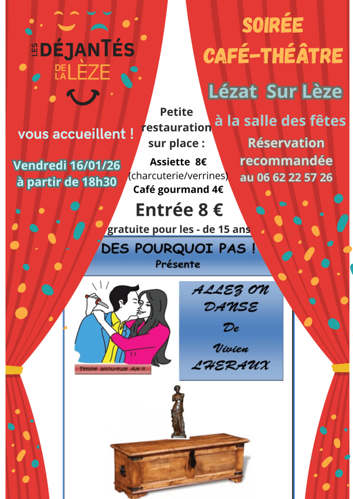 Les Déjantés de la Lèze, c’est une troupe de théâtre (comédiens, techniciens, souffleurs….), une bande de joyeux lurons investis, engagés à apprendre, à participer à la promotion du théâtre amateur, à la diffusion d’œuvres, à la production et création de spectacles.
